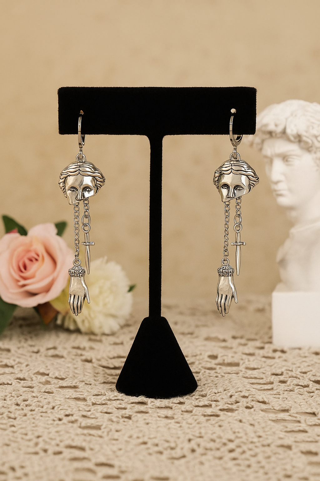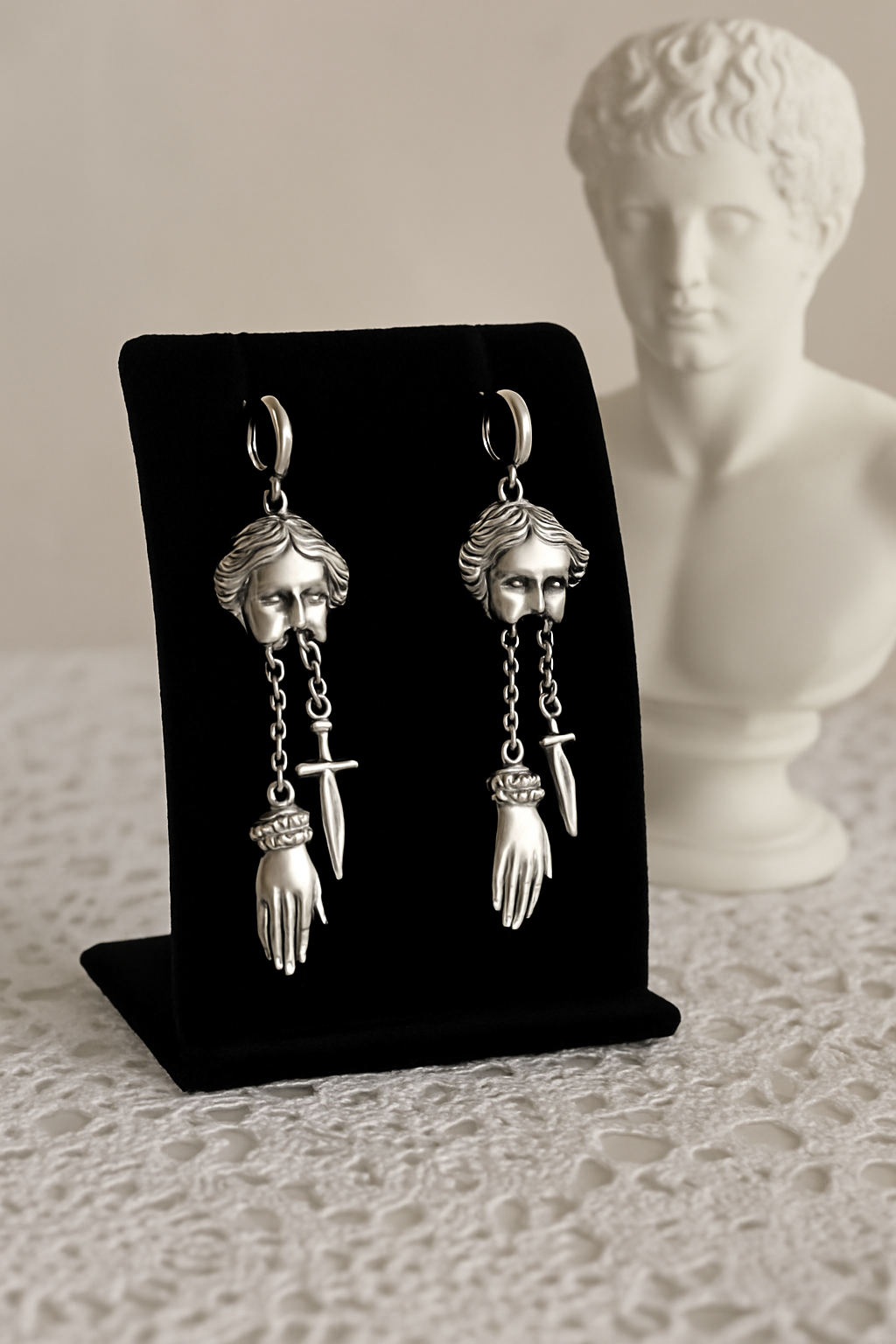 Entdecken Sie diese atemberaubenden Ohrringe mit eklektischem Stil, entworfen für alle, die den Mut haben, aufzufallen. Jeder Ohrring zeigt ein in zwei Hälften geteiltes römisches Gesicht, das als klassisches Relief mit einem ruhigen, aber kraftvollen Ausdruck gestaltet ist. Von der Basis hängen zwei zarte Ketten: Eine trägt einen detaillierten Handanhänger mit einer kunstvoll gestalteten Hand, die andere ein symbolisches, antik anmutendes Schwert.