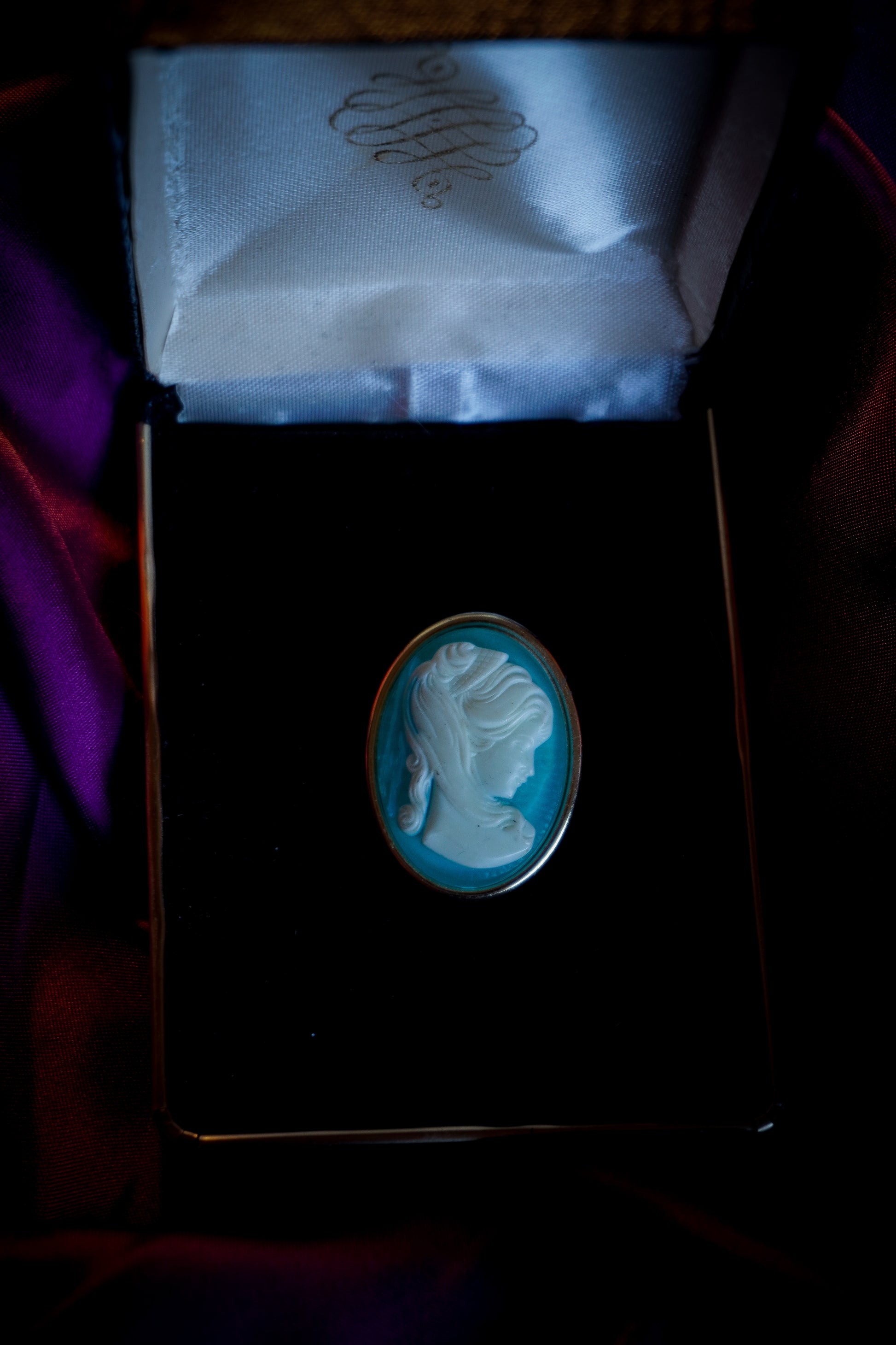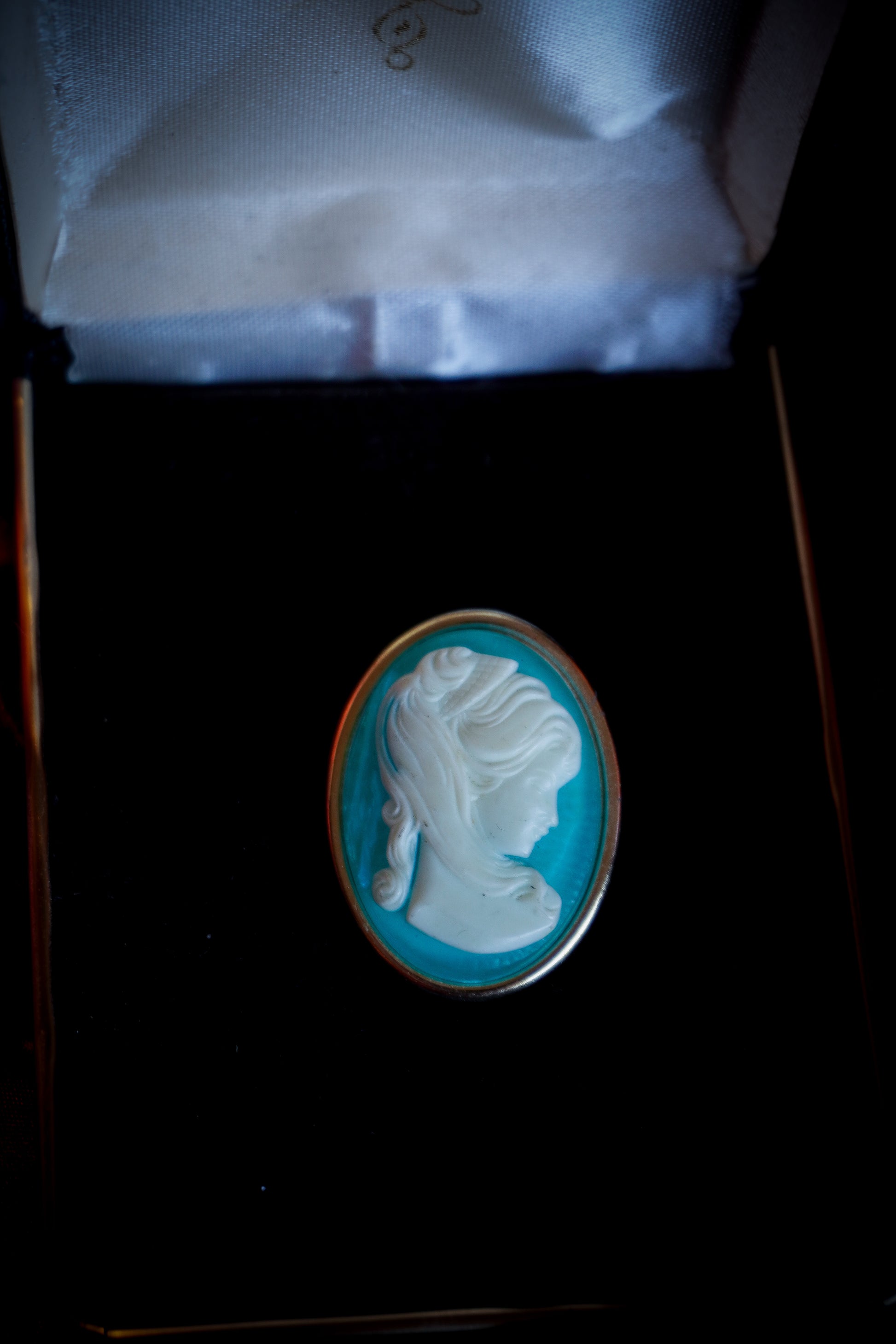 Goldene Kamee - Brosche mit einem türkis / weißem Relief